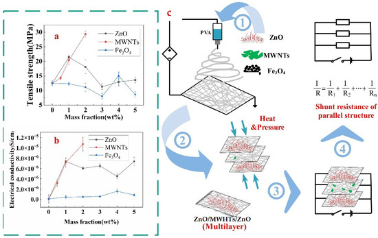 Multivariate and multilayer nanofibre membranes were produced by different univariate and monolayer electrospun nanofibre membranes through the heat and press process, as presented in Figure 4c. Figure 5 indicated that the electrical conductivity of ZnO/MWNTs/ZnO was better than that of ZnO/Fe3O4/ZnO due to the contribution of higher electrical conductivity of PVA/MWNTs. The four-layer membranes were prepared with two interlayers (Fe3O4 and MWNTs). Finally, the additional Fe3O4 was added to the four-layer membranes. Figure 5 shows that the increase in conductivity was consistent through the theoretical calculation and actual experimental values. Better conductivity was observed when more layers were used. Although the inter-layer Fe3O4 membrane possessed lower conductivity, however, the effect on the conductivity of the multilayer membrane was greater than that of the single membrane itself.