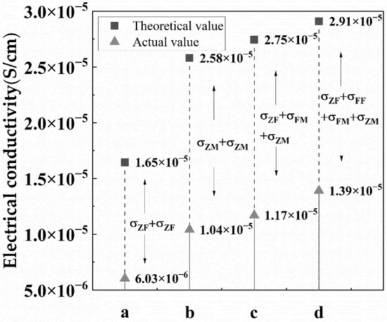 where σn−1⋅n is the lost conductivity due to the incompatibility of between adjacent membrane. If the two adjacent films have similar conductive particles, the σn−1⋅n is assumed to be zero. The lost conductivity of each adjacent film could be calculated. Finally, the σZF,σZM, and σFM were worked out through the theoretical value and actual value. The predicted actual electrical conductivity of the ZnO/Fe3O4/Fe3O4/MWNTs/ZnO membrane based on Equation (3) was 1.335 × 10−5 S/cm, and the error value was 3.96%, lower than 0.05. Therefore, Equation (3) was considered able to predict the multivariate and multilayer membranes.