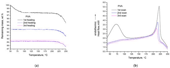 (a) Three consecutive TGA heating cycles of PVA; (b) Three consecutive DSC scans of PVA.