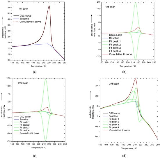 In order to provide more insights for the DSC signal alterations, curve fitting (with four Gauss peaks) was performed on the DSC peaks presented in Figure 1. As it has already been pointed out [12], the determination of the proper baseline for integrating or performing fitting in a thermochemical transition peak is complex, since the baseline is altered during the transition due to the various competitive and overlapping effects. In Figure 2a, the DSC curve from the first scan of PVA, along with the cumulative fit peak and the baseline, are presented. As can be seen, in order to take into account the fact that mass loss occurs during the thermochemical transition, a baseline comprising two linear parts was adopted. The two linear parts of the baseline intersect at the maximum of the DSC peak. The first part of the baseline is characterized by the endothermic slope, representing the expected increase in heat capacity caused by an increase in specific heat capacity, due to an increase in temperature, or heat absorption due to decomposition. The second part of the baseline has an exothermic slope, representing the decrease in the heat capacity caused either by the decrease in mass, due to decomposition or/and the heat release from the exothermic reactions among the decomposition products. In Figure 2b–d, the fitted peaks for the three DSC peaks of the respective scans of PVA are presented. As can be seen, in all three scans, at least one negative peak is needed for fitting the DSC curve. It should be mentioned that in the preliminary fitting trials, it was observed that no satisfying coincidence of the raw and cumulative fit peak was achieved if fitting was performed with two or three fit peaks instead of four. The necessity for performing fitting with four peaks arises from the high asymmetry of the DSC peak of PVA. Additionally, it should be noted that the position as well as the areas of the fit peaks are baseline sensitive. For example, by altering the baseline, four positive peaks, or more than two negative peaks, could be obtained; however, above, the reason for choosing this baseline was justified. It is stressed that after the determination of the baseline, the fitting procedure was performed without setting any requirements/conditions, e.g., at least one of the fit peaks being negative. As mentioned above, in order to describe the overall peak, at least one negative peak is needed.