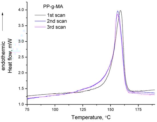 The first TGA heating of PP-g-MA which was used in this study was presented recently in the discussion of LLoD [14] and, precisely, up to 180 °C mass loss of 0.37 wt.% occurs. This mass loss occurs at a temperature range which overlaps with the DSC peak of PP-g-MA. In the second and third TGA heating, no mass loss is detected (curves not shown). In Figure 3, the DSC curves of PP-g-MA for the first, second and third heating cycle are presented. Since only in the first heating of PP-g-MA mass loss was detected in TGA, this mass loss could be attributed to the evaporation/desorption of water and other impurities. However, such processes are endothermic, and the required heat should be hidden/overlapped by the “melting” peak. In addition, if the mass loss is attributed to factors such as the evaporation of impurities, well, it surely is a very interesting coincidence that the impurities vaporize at the same temperature range at which the polymer melts. However, as will be presented in the following sections, similar observations can be made for other polymers. Thus, it is difficult to accept that the impurities of PP-g-MA or PVA or PVC have boiling points close to the melting points of the respective polymers. Additionally, and more importantly, alterations in the chemical structure of PP-g-MA can be detected by FTIR. Before discussing the FTIR results for PP-g-MA, it is stressed that as in the case of PVA, and in all three DSC scans of PP-g-MA (Figure 3), the DSC peak is highly asymmetrical and also, the apparent heat capacity of the sample is decreased at the end of the “melting” peak compared to its values before the peak (simply this decrease is more mild compared to that of PVA, and is related to the lower extent of mass loss).