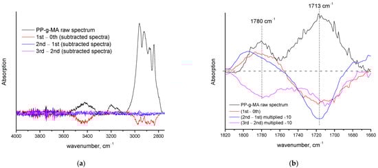 FTIR spectrum of PP-g-MA raw material and subtracted spectra before and after three consecutive heating cycles at 170 °C: (a) region 4000–2750 cm−1; (b) region 1820–1660 cm−1.