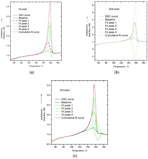 Fitting of the DSC curves of PP-g-MA: (a) first scan; (b) second scan; (c) third scan.