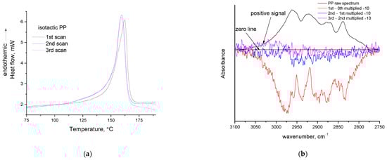 (a) Three consecutive DSC scans of isotactic PP sample; (b) FTIR spectrum of PP raw material and subtracted spectra before and after three consecutive heating cycles at 170 °C in the region 3100–2750 cm−1.