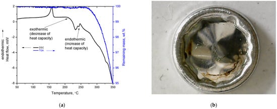As can be seen in Figure 7a, around 250 °C, an endothermic peak appears which overlaps with the initiation of mass loss in TGA. This endothermic contribution can be related to the sensible decomposition detected in TGA. The DSC baseline after this temperature range is highly exothermic and is governed by the mass loss whose occurrence is clearly detected in TGA. The actual mass loss out of the DSC pan is confirmed by the photograph of the DSC pan after the measurement up to 350 °C, which is presented in Figure 7b. The slope of the DSC baseline is less negative compared to the mass loss slope in TGA (Figure 7a), since heat is continuously absorbed by the sample and this tends to shift the DSC baseline towards the endothermic direction. However, as mentioned above, PP is known to decompose at lower temperatures, i.e., in the range 177–217 °C [38], and in the DSC curve (Figure 7a) an intense exothermic shift of the baseline is clearly visible at around 220 °C. As discussed numerous times throughout the text, the exothermic shift is related to decomposition (energy release from reactions among the decomposition products). In addition, DSC has no similarity to TGA limitation (LLoD) in detecting mass loss due to a sample’s buoyancy, since, in contrast to TGA, the DSC sensor is influenced by the real mass of the sample inside the pan and not from the apparent weight of the sample. Thus, if actual mass loss out of the DSC pan occurs, this would be directly detected by DSC, since less heat would be required in order to keep the same rate of temperature increase in the sample and in the reference (empty) pan. This mass loss would not be detected by TGA until it became high enough to surpass the sample’s buoyancy [14]. However, besides the “melting” peak, there is no other effect which can be responsible for the intense exothermic shift at 220 °C.