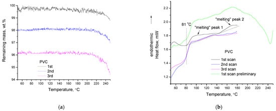 (a) Three consecutive TGA heating cycles of PVC up to 250 °C. The green line points out a decreasing trend of mass in the range 125–200 °C in the first heating; (b) Three consecutive DSC scans of PVC up to 180 °C and a preliminary first scan up to 250 °C. The dashed line has been drawn to enable the recognition of the peaks.