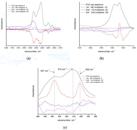 FTIR spectra of PVC raw material and subtracted spectra before and after three consecutive heating cycles at 170 °C: (a) in the region 3200–2750 cm−1; (b) in the region 1500–1400 cm−1; (c) in the region 660–580 cm−1.