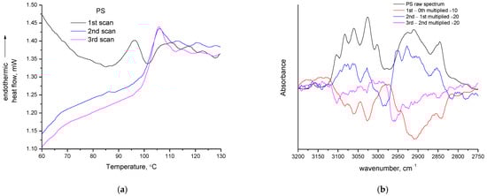 (a) Three consecutive DSC scans of the PS sample; (b) FTIR spectrum of PS raw material and subtracted spectra before and after three consecutive heating cycles at 130 °C in the region 3200–2750 cm−1.