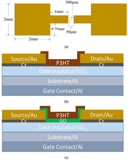 The fabrication of M-OTFTs followed a nearly identical fabrication process, except for adding a GO layer underneath the P3HT. An aqueous dispersion of GO was obtained from Goographene, Inc. It was received with a concentration of 5 mg/mL in water. According to the manufacturer, the dimensions of the GO sheets were several hundred nanometers up to several micrometers in the XY plane and 0.7–1.2 nm in thickness []. The GO suspension was further diluted to 0.5 mg/mL with DI water. Once the gate, drain and source contacts were deposited, the GO solution was ready to be coated. The GO solution was agitated in an ultrasonic bath for 4 min and immediately spin-coated onto the wafer at an acceleration of 500 rpm/sec until a maximum speed of 1000 rpm was reached and maintained for 60 s, and subsequently baked at 110 °C for 40 min. The thickness of the GO was measured from an Atomic Force Microscopy (AFM) image and determined to be 1.5 nm. The P3HT was then spin-coated on top of the GO layer at an acceleration of 1000 rpm/sec until a maximum speed of 2000 rpm was reached and maintained for 60 s, and subsequently baked at 110 °C for 1 h. Both the GO and the P3HT layers were then patterned together in the same way as the standard devices. The dimensions of the conductive channel were essentially identical to the standard devices. 226 M-OTFTs were fabricated on a single wafer. The schematic structure of the modified device is illustrated in Figure 1c, and it is identical to the standard devices except for the GO interfacial layer. As illustrated in Figure 1c, the P3HT/GO was not only limited to the channel area but has an overlap onto the electrodes. As explained for the standard devices, these devices were designed this way to increase the contact area between Au and P3HT/GO [].