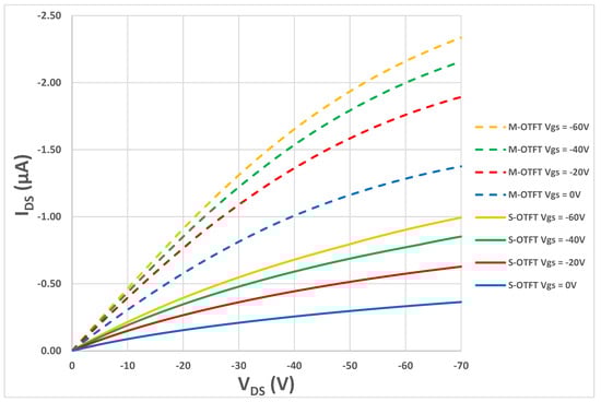 IDS-VDS output characteristics of a S-OTFT vs. M-OTFT at different values of VGS. The solid lines are for a S-OTFT device and the broken lines are for a M-OTFT device.