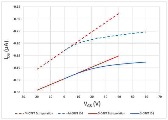 The transfer curve of a S-OTFT at VDS = −5 V is shown with a solid blue line in Figure 3. The extrapolation line is shown in red. The threshold voltage is found to be 26.09 V. The transfer curve of a M-OTFT at VDS = −5 V is shown with a broken line in Figure 3, with the extrapolation line shown in red. The threshold voltage is found to be 47.24 V, which is significantly higher than the standard device. This high threshold voltage for the modified device is not optimal for low-power devices.