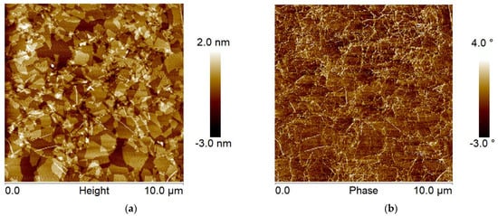 Since there is no thermodynamic tendency for dewetting of P3HT from GO, we suppose the surface morphology of the GO layer is the decisive factor in the formation of the P3HT layer with significant surface roughness. In fact, from careful observation of the phase image for the P3HT/GO layer (Figure 5d), one can see that the elevations on the surface originate from the “line-like” depressions. These features reflect the presence of the nanosheet edges on the GO layer. Therefore, we suggest that the origin of the relatively rough P3HT/GO layer is the surface topography. Namely, the edges of the GO nanosheets, to a certain extent, guide the spreading of the polymer solution during spin-coating. In fact, it is well established that topographical features on the surface, along with wettability, solution concentration, and spin speed/duration, affect the morphology of the spin-coated polymer films [].