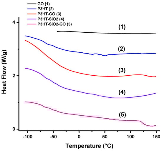 The DSC data for the model materials, as well as for pure P3HT and GO nanosheets (annealed under the same conditions), is presented in Figure 6. We did not conduct measurements for pure SiO2 particles since DSC data for them is available from the scientific literature []. First of all, we note that GO does not have any thermal transitions in the temperature region studied. For the pure P3HT, a typically found thermal behavior with a quite broad glass transition region is observed. The Tg reported in the scientific literature for P3HT varies from −113 °C to 106 °C depending on chemical structure, synthetic procedure, and sample preparation method [,,,,]. For our pure P3HT sample, glass transition occurs between −90 °C and −14 °C. Similar thermal behavior of the polymer in the Tg region is found for all model samples studied here. Therefore, the diffusion of a significant number of the macromolecular segments in the P3HT matrix is not restricted by the presence of the SiO2 and GO solid boundary. When P3HT is mixed with SiO2 particles, there is an additional broad and shallow endothermic peak at higher temperatures. It was reported elsewhere that SiO2 particles between 40 °C and 180 °C can demonstrate an endothermic peak originating from the volatilization of water on the surface of particles []. Similar behavior is seen in our DSC scan for the P3HT/SiO2 mixture. For the P3HT/GO samples, we note an additional Tg-like second-order transition at about 120 °C. The transition is not present in pure P3HT and P3HT/SiO2 samples. We associate this transition with the onset of movement of macromolecule segments that are in contact with the GO surface. The same transition was found for the P3HT/GO/SiO2 mixture. The transition is even more pronounced for this mixture since the concentration of P3HT is lower in this case, and more chain segments are in contact with the GO surface. Based on the DSC measurements we can qualitatively conclude that P3HT chain segments are more mobile when in contact with GO than when they are in contact with SiO2. As mentioned above, we associate this increased mobility with formation of larger P3HT grains in M-OTFTs and therefore, better electrical performance of M-OTFT devices.