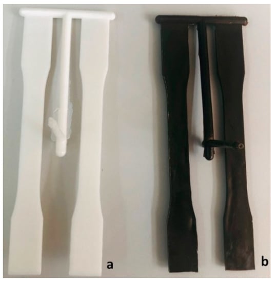 Image of dog bone test specimen prepared: (a) blend and (b) composites reinforced with 15 wt.% lignin.