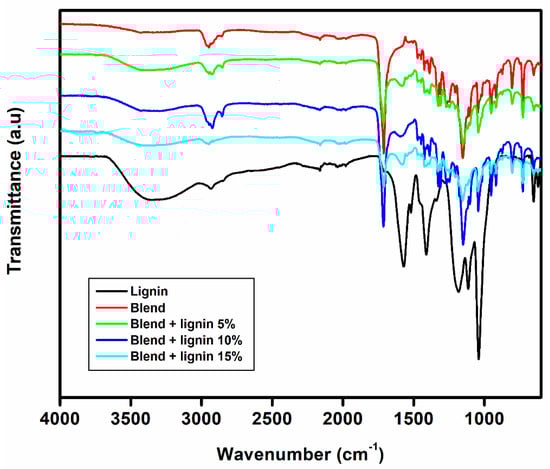 FTIR spectra of lignin, polymer blends, and composites.
