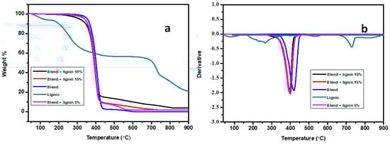 (a) TGA and (b) DTG curves of the lignin, biopolymer blend, and composites.