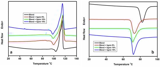 DSC curves related to the second heating and cooling of biopolymer blends and hybrid composites are shown in Figure 4a,b. The glass transition temperature (Tg) of the blend and hybrid composites was not visible. The incorporation of fillers into the blend did not change the melting behaviour of the materials, as shown in Figure 4a and Table 4. Their melting temperatures (Tm) remained the same (115 °C). However, when increasing the lignin loading from 5 wt.% to 15 wt.%, Tm did not show any alterations. A similar trend was reported in other studies [5,18], where lignin was introduced into PBS and PBAT, respectively. The melting and crystallization enthalpies, as well as cold crystallization temperature (Tcc), decreased when the filler was incorporated. In addition, when the filler loading increased, the melting and crystallization enthalpies and Tcc further decreased. Sahoo et al. [40] reported comparable results. In their study, they investigated the effect of lignin on the crystallization and melting behaviour of PBS composites reinforced with lignin. The incorporation of lignin increased Tg, which suggests a good interaction between the polymer and filler. The addition of up to 50 wt.% increased the crystallinities of the material. Moreover, the addition of lignin, irrespective of loading, had no effect on the melting behaviour of PBS.