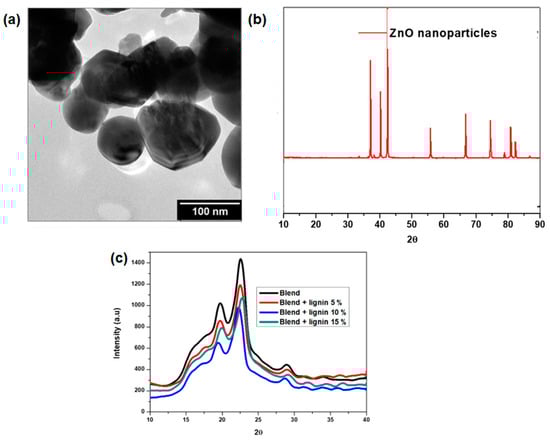 The morphology of the synthesized ZnO particles was found to be largely hexagonal, with some slightly spherical particles present, as shown in Figure 5a. The diameter of the ZnO nanoparticles was estimated by measuring at least 100 particles using ImageJ, and it was found to range between 60 and 110 nm, with most of them having an average size of 80 nm. The PXRD pattern of the ZnO is shown in Figure 5b. The pattern is consisted with that of hexagonal wurtzite (JCPDS No. 36–1451). The reflections observed were at 2θ positions of 37.14, 40.07, 42.57, 56.10, 66.5, 74.66, 78.93, 80.97, and 82.322°. These were indexed as (100), (002), (101), (102), (110), (103), (200), (112), and (201), respectively. There were no other peaks observed, suggesting that the product was pure. The PXRD pattern of the blend was characterized by peaks at 2θ positions of 17.48, 19.70, 22.55, and 28.93. These peaks are characteristic of PBS, as was reported by Tang et al. [41], who reported a similar XRD pattern. The peaks associated with PBAT were not observed, as PBAT is much more amorphous when compared with PBS, and PBAT formed a lower ratio of the blend, 30 wt.%. The amount of ZnO nanoparticles added to the blend was 1.5 wt.%; although it is crystalline, the weight percentage was too low to be observable on the PXRD pattern. This meant that the PXRD of the blend was similar to that of PBS and the hybrid composites. This indicates that the addition of PBAT, lignin, and ZnO nanoparticles did not influence the crystal structure of the PBS matrix.