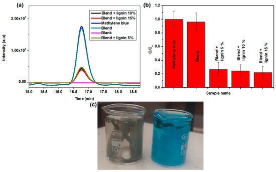 (a) Chromatogram of methylene blue, (b) photocatalytic efficiency of the various materials, and (c) methylene blue test solutions after 2 h photodegradation experiments using (left) blend + lignin 15% and (right) blend.