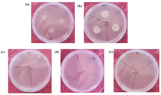 Images of petri dishes of the antimicrobial tests on various samples: (a) control, (b) blend, (c) blend reinforced with 5 wt.% lignin, (d) blend reinforced with 10 wt.% lignin, and (e) blend reinforced with 15 wt.% lignin.