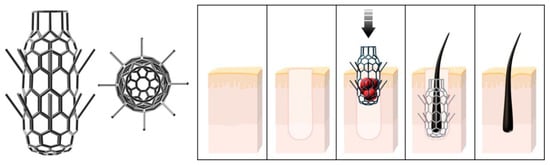 One of the main challenges of the mini-scaffold-based approach is the design of mini-scaffolds. We will consider three cases. The design of so-called “lockyballs” with special hooks enabling interlockable self-assembly was not a trivial engineering task because both too many hooks and too few hooks prevent self-assembly. Optimal interlocking has been achieved only after using the so-called “elevated pentagon,” which serves as some sort of loop and enables effective interlocking of two closely placed lockyballs and, thus, rapid biofabrication of tissue-engineered constructs with a desirable patient-specific geometric shape (Figure 1) [7]. In this context, “lockyballs” serve as a variant of interlockable “Lego” blocks. It was very interesting that the replacement of “hooks” and “loops” employed originally in the design of classic biomimetic “Velcro” on simple arrows also enabled even more effective and more flexible interlocking (Figure 1). Arrows or arrow-headed spikes in this context serve both as classic hooks and loops in “Velcro”, simultaneously [8]. Moreover, the design of a spiral-like mini-scaffold with attached arrows will enable the rapid biofabrication of tubular tissue-engineered constructs of different diameters, wall thickness, and layered composition by combining a scaffold-free cell sheet technology with snake-like arrow-headed mini-scaffolds. For example, sequential attachment of several cell sheet monolayers with arrowed snake-like spiral mini-scaffold will enable rapid biofabrication of the tissue-engineered vascular graft with an endothelial cell-derived monolayer as an intima, smooth muscle cell-derived multilayer as a media, and fibroblast cell-derived multilayers as an adventitia. Finally, the combination of superior flexibility in the precision fabrication of the internal three-dimensional geometry of mini-scaffolds using two-photon polymerization and photo-sensitive polymers open unlimited possibilities for realizing the desirable advanced complex mini-scaffold design. Finally, the original unique design of a mini-scaffold for in situ robotic bioprinting of human hair has been recently developed (Figure 2).