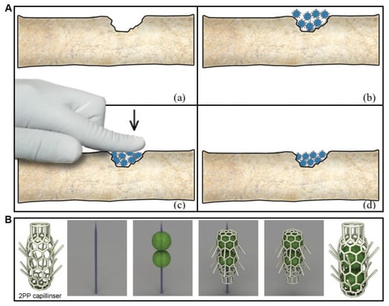 (A) Schematic of in situ rapid biofabrication of an osteogenic tissue-engineered construct using tissue spheroids encaged into interlockable concentric lockyballs (Reprinted with permission from [8]. Copyright [2015], American Vacuum Society); (B) Insertion of pairs of tissue spheroids into the mini-scaffold “capillinser” (Reprinted from [32]).