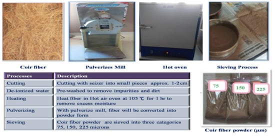 To remove impurities and dirt, raw coir fibers are trimmed to 1–2 cm length and pre-washed with de-ionized water. The fibers are then dried for 1 h in a hot air oven at 105 °C to eliminate excess moisture. Coir fibers are fully dried and ground using a pulverising method (Saral Pulverizer, Gujarat, India), followed by size severance using a sieve shaker [49] as shown in Figure 1.