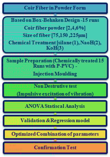 To prepare coir fiber reinforced with plasticized polyvinyl chloride composite in accordance with the BBD, which is depicted in Figure 2, the coir fiber powder content (2 wt.%, 4 wt.%, and 6 wt.%) in combination with the size of the fiber (75 μm, 150 μm, and 225 μm) are chemically treated with triethoxy(ethyl)silane (1), sodium hydroxide (NaOH) (2) and potassium hydroxide(KOH) (3). Figure 3 describes the procedure for chemical treatments.