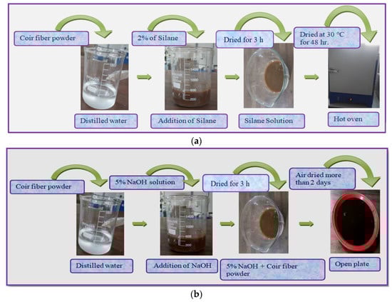 The main drawbacks of natural fiber-reinforced polymer composite are higher water absorptiveness, inferior fire resistance and lower mechanical properties [17,18]. Chemical treatments such as polymer coupling agents, silane, alkali and isocyanate treatments, as well as permanganate [19,20], are utilised to increase interfacial adhesion between the natural fiber surface and polymer [21,22,23]. Sodium hydroxide (NaOH) treatment with a 3 h immersion stage resulted in the maximum tensile strength [24]. Coir fiber composite, treated with 5% (w/v) potassium hydroxide (KOH), offers better mechanical qualities than untreated coir fiber composite [25]. The flexural and tensile strengths of methacryloxy-propyltrimethoxy (silane treatment) bamboo fibers are 36.1 MPa and 54.7 MPa, respectively, which are 15.4% and 23.6% higher than untreated bamboo fibers-reinforced polypropylene composites [26].