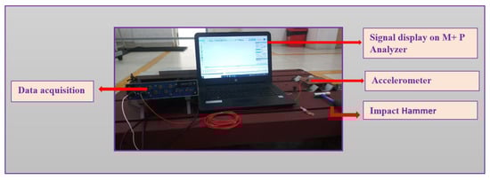 The analysis of the elastic constant of materials using impulse excitation of vibration is a non-destructive method. It is non-destructive to material qualities and can assess mechanical properties including resonance frequency and internal friction. As per ASTM 1876 [53], the elastic constants (Young’s modulus (E) and shear modulus (G)) are computed from resonance frequency under various conditions such as torsion mode, bending mode or bending-torsion mode. An impact hammer is used to excite the sample in bending or torsion mode. The vibration caused by the collision on the surface of the samples is detected using an accelerometer. Data acquisition is used to gather the signals, which are transferred to M + P analyzer software to perform Fourier transform (FFT) analysis, as shown in Figure 5.