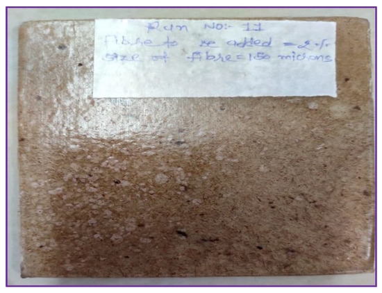 Samples were prepared by reinforcing coir fiber powder with plasticized-PVC according to BBD, as presented in Table 2. A hydraulic injection moulding machine was used for the manufacturing of 15 samples. By shearing action of the screw, coir fiber powder and plasticized PVC were fed into a barrel from a hopper, in which the materials were melted. Then the screw stopped rotating and materials moved forward into the mould. The cooling cycle began once the mould was entirely filled and the screw continued to apply consistent pressure on the polymer–fiber mixture. The mould was opened when the cycle finished and a sample with dimensions of 115 mm × 95 mm × 3 mm was expelled, as illustrated in Figure 4.