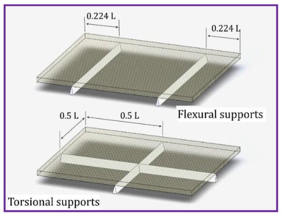 The specimens were prepared according to ASTM1876, pertaining to impulse excitation of vibration, as shown in Figure 7. In an effort to attain the resonance frequency of the sample using flexural mode, the sample is positioned with two support systems located at 0.224 mm distance from the total length of the specimen at each end. To acquire the resonance frequency of the sample using torsional mode, the specimen is located at the centre point of the symmetrical and cross-shaped support as illustrated in Figure 8.