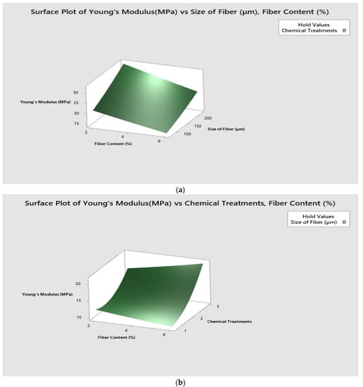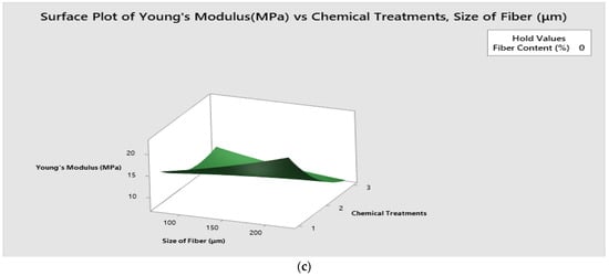 Figure 9c elucidates the surface plot of Young’s modulus vs. chemical treatments/fiber size (μm). It culminated that a high Young’s modulus was observed for the combination of triethoxy (ethyl) silane treatment and 225 μm fiber size.