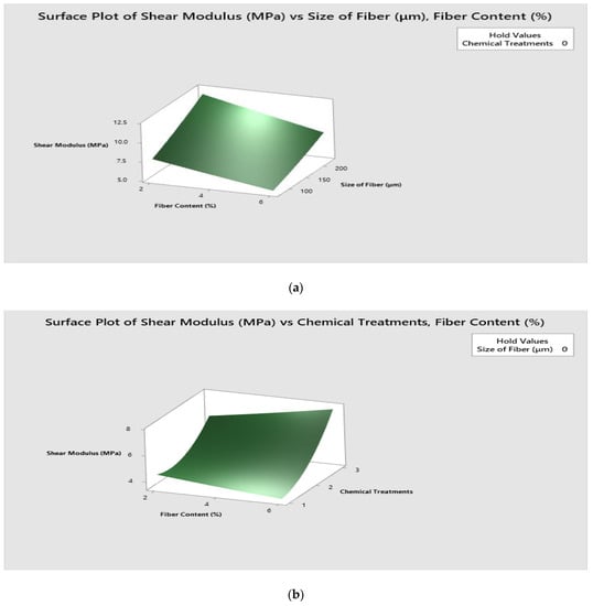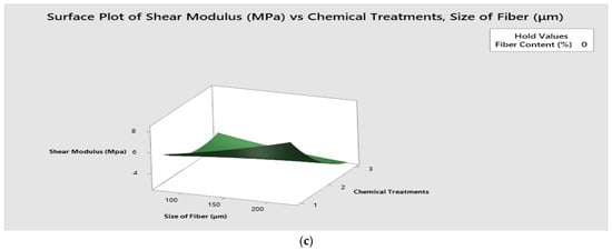 Figure 10c explicates the surface plot of shear modulus vs. chemical treatments/fiber size (μm). It is theorized that high shear modulus is observed for the combination of triethoxy (ethyl) silane treatment and 225 μm fiber size.
