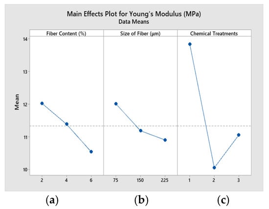Main effects plot for Young’s modulus. (a) fiber content (%) (b)size of fiber (c) chemical treatments.