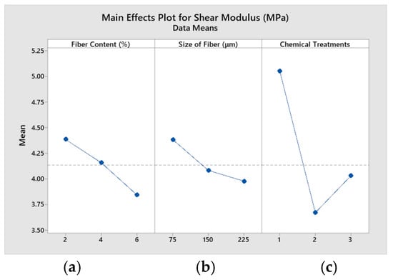 Figure 12 shows the main effects plot for shear modulus of the composites. Figure 12a reveals that shear modulus increases with decrease in fiber content from 2% to 6%. Figure 12b exhibits that shear modulus increases when fiber size decreases from 75 μm to 225 μm. Figure 12c indicates that shear modulus is high when triethoxy (ethyl) silane-treated fiber is used in composites, as compared with other treatments.