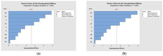 Pareto charts of the standardized effects on elastic constants. (a) Young’s modulus (b) shear modulus.