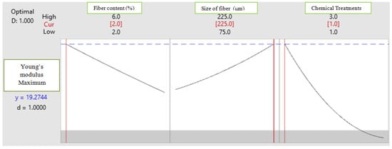 Figure 14 represents a response optimization plot for Young’s modulus, where the X axis shows fiber content (wt.%), fiber size (μm) and chemical treatment and Y axis shows Young’s modulus. It illustrates that a high Young’s modulus is obtained for the combination of coir fiber content with 2 wt%, fiber size with 225 μm and treatment with triethoxy (ethyl) silane.