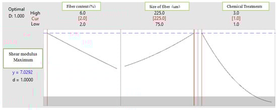 Figure 15 represents response optimization plot for shear modulus, where the X axis shows fiber content (wt.%), fiber size (μm) and chemical treatment and Y axis shows shear modulus. It illustrates that high shear modulus is obtained for the combination of coir fiber content with 2 wt%, fiber size with 225 μm and treatment with triethoxy (ethyl) silane.