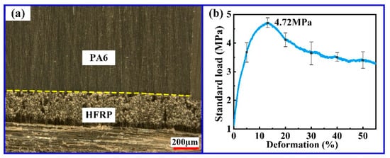 At the pressure holding stage, the molten PA6 crystallized again and solidified gradually. When the holding time was short, the PA6 was heated unevenly in different areas, thus forming holes inside the PA6 easily and resulting in the decrease in the injection molding quality and tensile strength. As the holding time increased, PA6 crystallized more fully and solidified on the HFRP surface. Therefore, when the holding time was 3 s, the tensile strength of the composite part could reach 10.68 MPa. However, when the pressure holding time was too long, the pressure in the cavity of PA6 increased, thus easily resulting in the uneven distribution of stress inside the composite part, which could cause defects such as flying edges and limit the mechanical properties and tensile strength of the composite part.