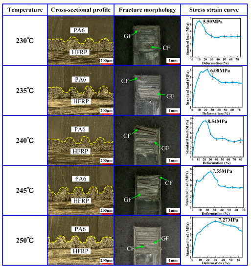 At the effect of the mold temperature, PA6 changed from a solid state to a melting state, presenting enough flowability. Therefore, the mold temperature played an important role in providing PA6 with sufficient flowability. In order to study the effect of the mold temperature on the molding quality of the composite part, the composite parts with HFRP and PA6 were formed by the injection molding method using different mold temperatures of 230 °C, 235 °C, 240 °C, 245 °C and 250 °C. During the experiment, the injection pressure was set to 8 MPa, the holding pressure was set to 5 MPa and the holding time was set to 2.5 s. The tensile strength of the composite part was tested by the universal tensile machine. The cross-sectional profile and fracture morphology of the composite part were determined by the stereo microscope. The experimental results are shown in Figure 3.
