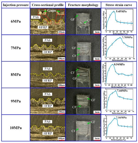 When the injection pressure was 6 MPa, gaps were observed at the interface of HFRP and PA6. Correspondingly, the micro-grooves on the surface of HFRP were not completely filled with PA6, which caused the poor injection molding quality of the composite part. As the injection pressure increased, the PA6 could fill the micro-groove structure on the HFRP surface more easily, and the injection molding quality of the composite part could be increased efficiently. When the injection pressure increased from 6 MPa to 8 MPa, the residual CF and GF on the fracture surface of the composite part increased gradually, and the tensile strength increased from 5.45 MPa to 8.54 MPa. However, as the injection pressure increased over 8 MPa, the residual CF and GF on the fracture surface of composite parts started to decrease gradually, and the tensile strength also decreased. When the injection pressure was 10 MPa, flying edges occurred in the composite parts, which would decrease the injection molding quality.