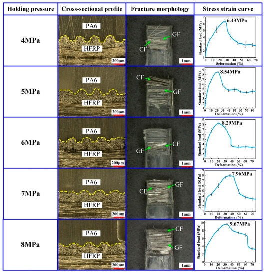 At the final stage of the injection molding process, it is necessary to apply certain pressure on the PA6 material in the molding core cavity to guarantee the molding quality of the composite part. This pressure was named by the holding pressure. In order to analyze the effect of the holding pressure on the molding quality of the composite part, the injection molding process was performed on the HFRP and PA6 at different holding pressures. The holding pressure was set to 4 MPa, 5 MPa, 6 MPa, 7 MPa and 8 MPa, respectively. During the experiments, the mold temperature was set to 240 °C, the injection pressure was set to 8 MPa and the holding time was set to 2.5 s. The experimental results are shown in Figure 5.