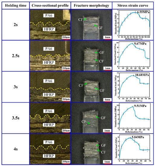 In order to ensure the injection molding quality of the composite part, the holding pressure needs to be maintained for a certain time, and this time is named by the holding time. A proper holding time is necessary to avoid the adverse effect of PA6 volume shrinkage caused by the injection molding process. To study the effect of the holding time on the injection molding quality of the composite part, the injection molding processes of the HFRP and PA6 were carried out at different holding times. The holding time was 2 s, 2.5 s, 3 s, 3.5 s and 4 s, respectively. During the experiment, the mold temperature was set to 240 °C, the injection pressure was set to 8 MPa and the holding pressure was set to 8 MPa. The experimental results are shown in Figure 6.