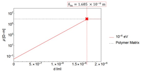 where represents the tunneling resistivity, e is electric charge, d is the shortest distance between the CNTs, h is Planck’s constant, m is equal to the mass of an electron and signifies the barrier potential of the polymer. is a crucial parameter that dictates the strength of the electrical tunneling effect. The relationship between the tunneling resistivity and the tunneling distance d is illustrated in Figure 1.