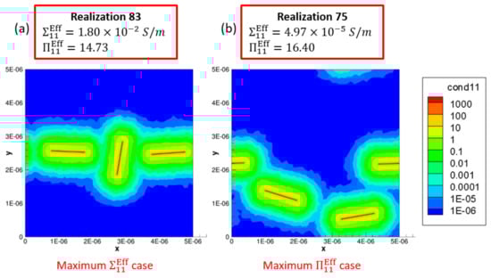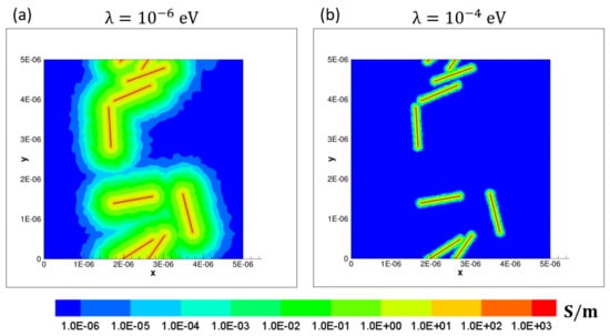 Contour plots of local conductivity for a specific realization with randomly oriented CNTs at a volume fraction of 0.56% using (a) barrier potential (percolated case) and (b) barrier potential (unpercolated case).