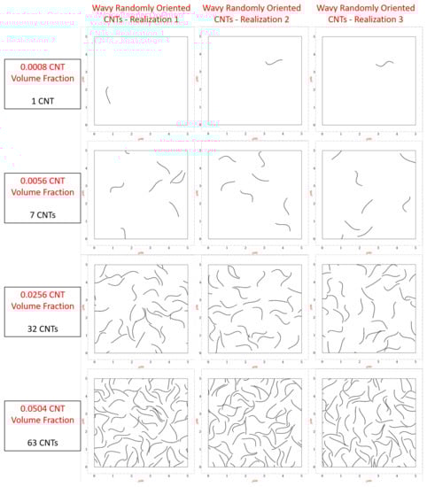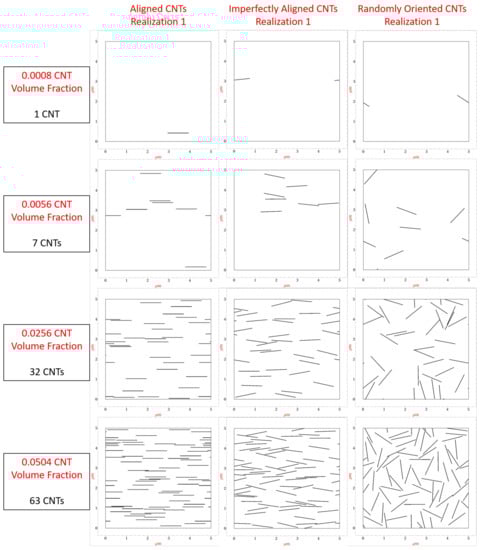 A library of numerous realizations with random seeding of CNTs are generated with CNT volume fractions of 0.08%, 0.16%, 0.24%, 0.32%, 0.40%, 0.56%, 1.04%, 1.52%, 2.00%, 2.56%, 3.04%, 3.52%, 4.00%, 4.56% and 5.04%. These volume fraction values correspond to 1, 2, 3, 4, 5, 6, 7, 13, 19, 25, 32, 38, 44, 50, 57 and 63, CNTs, respectively. Figure 3 shows the first realization generated for 0.08%, 0.56%, 2.56% and 5.04% CNT volume fractions, respectively, for the aligned, imperfectly aligned and randomly oriented case (with straight CNTs), respectively. The imperfectly aligned case has CNTs generated such that the angle made by the long axis of the CNT with the alignment direction () is at maximum . The present work models misalignment of to capture the partial alignment found in fabricated real world samples [].