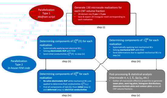 A flowchart algorithm describing the step-wise methodology used in this study is shown in Figure 6. The algorithm used herein is the same as the one used in []. In order to reduce the vast amount of computation time required if the computations were done serially, two different levels of parallelization were employed, type 1 and type 2. The first parallelization type is used in step (i) where the wolfram script is used to generate 130 realizations at every volume fraction and for each CNT orientation case. The next parallelization type is used for steps (ii) to (iv) where a previously developed finite element method program. The coupled electrical and mechanical BVP is solved for all realizations under all the test boundary conditions shown in Tables S1 and S2. This results in obtaining the components of the macroscale , and tensors. Both parallelization types are coupled together with the help of high performance computers to improve computation speed. Furthermore, ’GNU parallel’, a shell tool for executing jobs in parallel using one or more computers [], is used to direct the parallelized tasks, further improving computation speed.