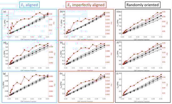 The stiffness components estimates for , and for all volume fractions for the three different orientation conditions with straight CNTs— aligned, imperfectly aligned (by ) and randomly oriented CNTs are shown in Figure 7. These plots depict the estimated value (calculated mean) of stiffness as a function of CNT volume fraction. In the present work, these estimate plots depict the mean with black data points and the mean ± standard deviation () with grey data points. The grey shaded in portion that exists between the black lines represents the uncertainty in the estimate. A statistical measure often used to depict deviation is the coefficient of variation, which is the standard deviation divided by the mean (). In the estimate plots found in this study, this quantity is plotted with red data points with its axis on the right hand side.