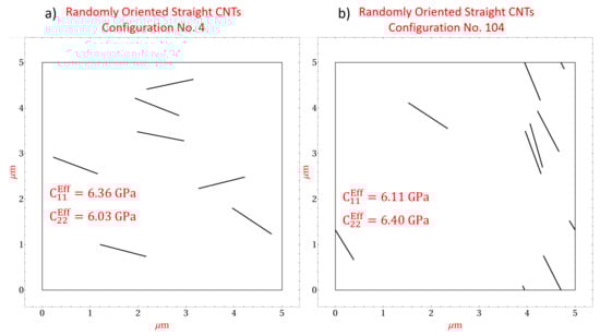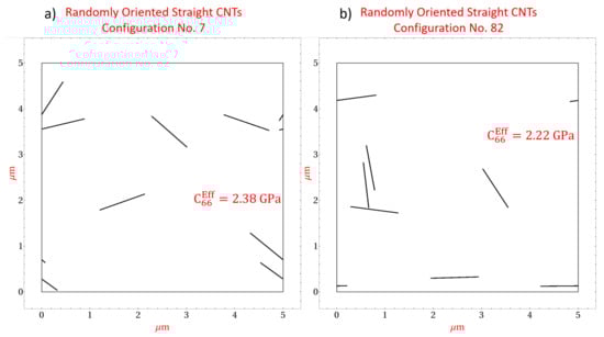 Figure 8 presents two specific microscale realizations with straight randomly oriented CNTs at a CNT volume fraction of 0.56%. Figure 8a depicts realization number 4 which yields effective stiffness components and . The discrepancy between and can be correlated with the orientation of the CNTs within realization number 4, where it is observed that most of the CNTs are oriented more towards the direction as opposed to the direction. As such, the mechanical reinforcement provided by the CNTs in response to an applied strain will be greater in the direction than the direction resulting in a larger compared to . Figure 8b depicts realization number 104 which yields effective stiffness components and . The discrepancy for this realization arises due to the same reason as realization number 4 but in this case the CNTs reinforce the direction to a larger extent than the direction. The effect of CNT orientation on the effective stiffness components can also be visualized for the shear component in Figure 9, which presents two microscale realizations, realization number 7 and realization number 82 at 0.56% CNT volume fraction with straight randomly oriented CNTs. Figure 9a yields and Figure 9b yields . The difference in these effective values arises because the CNTs in Figure 9a are oriented such that they are not favorably aligned in either the or directions, i.e., CNTs are oriented close to or radians, where as the CNTs in Figure 9b are oriented such that they are more in alignment with the or directions.